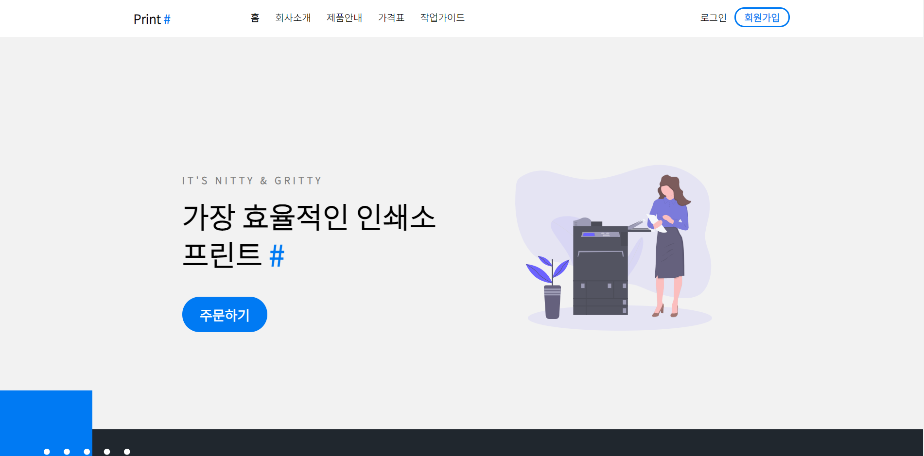 인쇄소 홈페이지를 의뢰받아 제작한다는 컨셉으로 구현하였습니다. 지금까지 공부한 HTML, CSS, Javascript를 사용하여 이해도를 높이고 실제로 웹페이지 제작시 어떻게 사용되는지를 익히는데 집중하였습니다. 대부분의 코드에 주석을 달아 다시 코드를 참고할 수 있도록 하였고 새롭게 배운 내용은 블로그에 기록하였습니다.