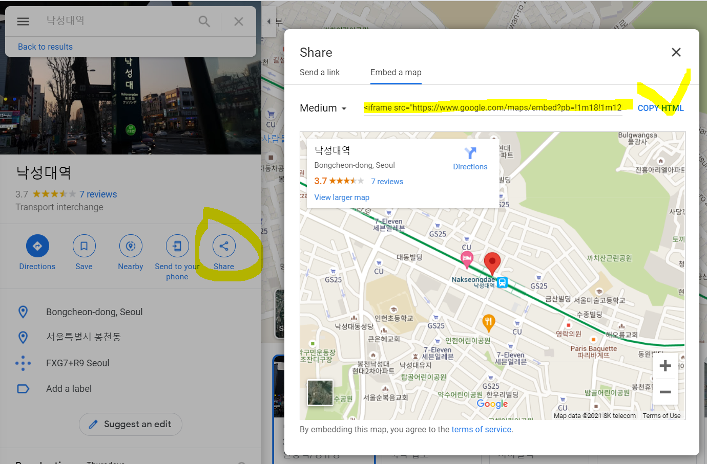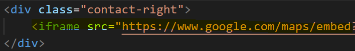 구글맵에 접속해 Share -> Embed a map 을 Copy해서 아래처럼 코드에 붙여넣는다