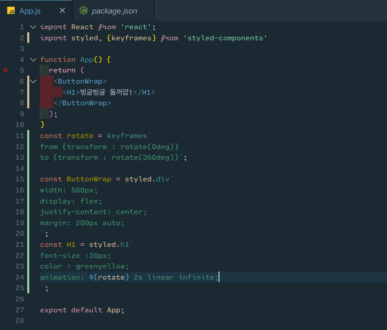 - 위 코드는 가장 기본적 형태이며 아래 styled-components의 꿀 문법을 살펴보자!