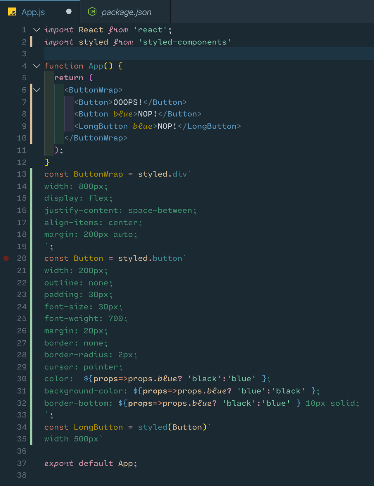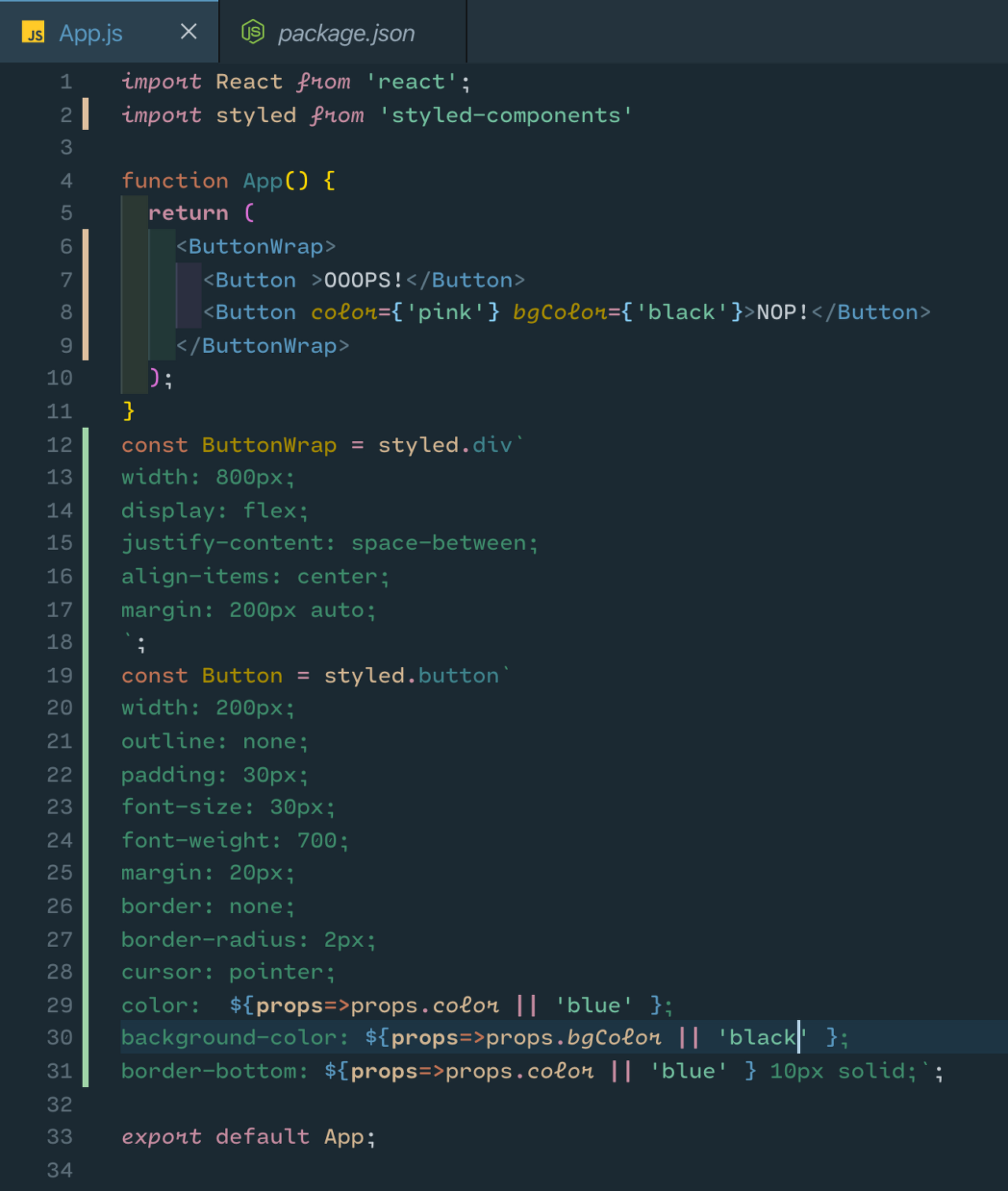 props => props.color || 'blue' : props로 color가 지정된다면 그 설정에 따르고, 프롭스가 없으면 'blue'로 지정
