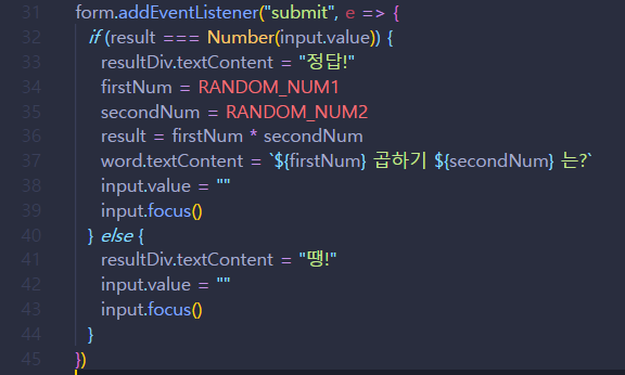 이러한 구구단의 정답을 받는 form 이 있고, 거기에 EventListener 를 추가해주었습니다.