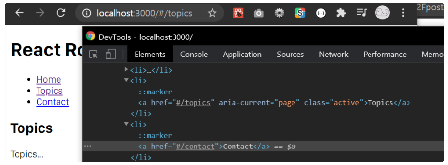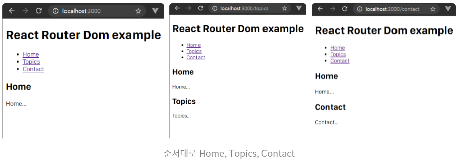 예를 들어, localhost:3000/ 는 Home 컴포넌트가, localhost:3000/topics는 Topics 컴포넌트가 나오는 것이다.
