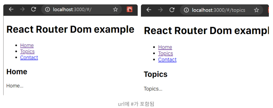 hash router를 사용하면 url이 localhost:5000/#/topics 처럼 중간에 해시가 들어간다. 이는 서버사이드가 해시 이후는 읽을 수 없게 처리해 가벼운 애플리케이션을 라우팅할때 사용된다.
