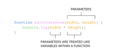 In the diagram above, calculateArea(), computes the area of a rectangle, based on two inputs, width and height. The parameters are specified between the parenthesis as width and height, and inside the function body, they act just like regular variables. width and height act as placeholders for values that will be multiplied together.