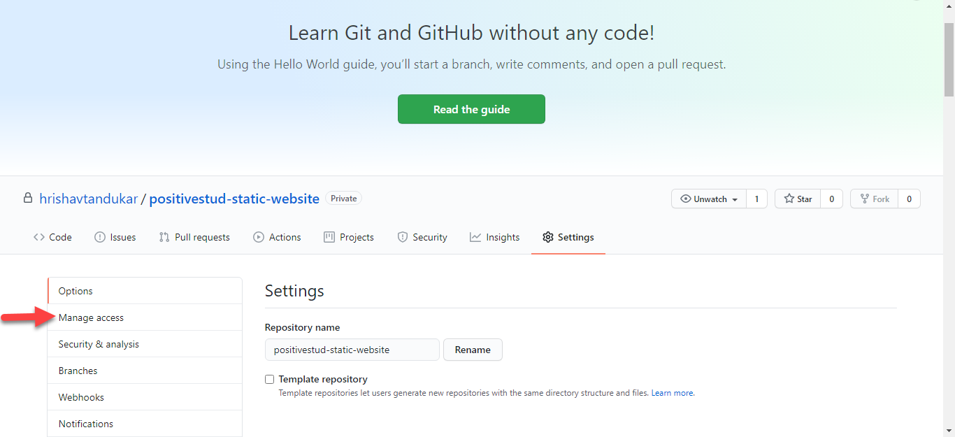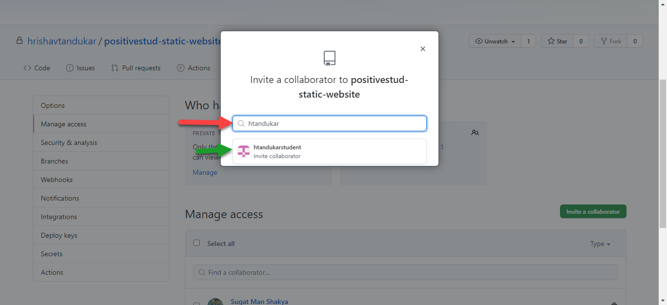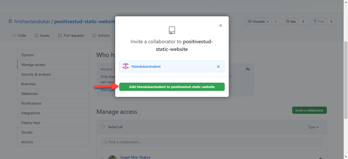 Step 6: Click on the ‘Add httandukarstudent to positivestud-static-website’ button as shown in the image below. In the button, ‘httandukarstudent’ refers to the name of the collaborator and ‘positivestud-static-website’ refers to the name of the repository.