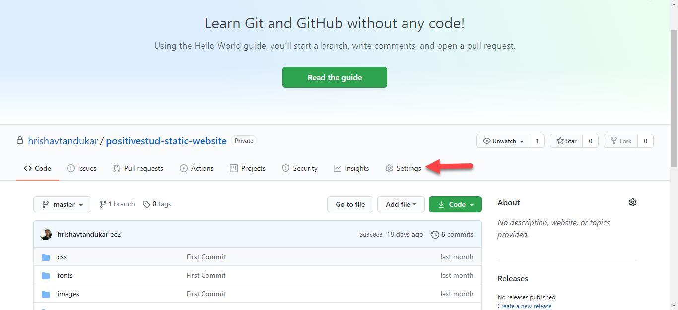 Step 2: After you have selected the repository, click on ‘Settings’ as shown in the image below.