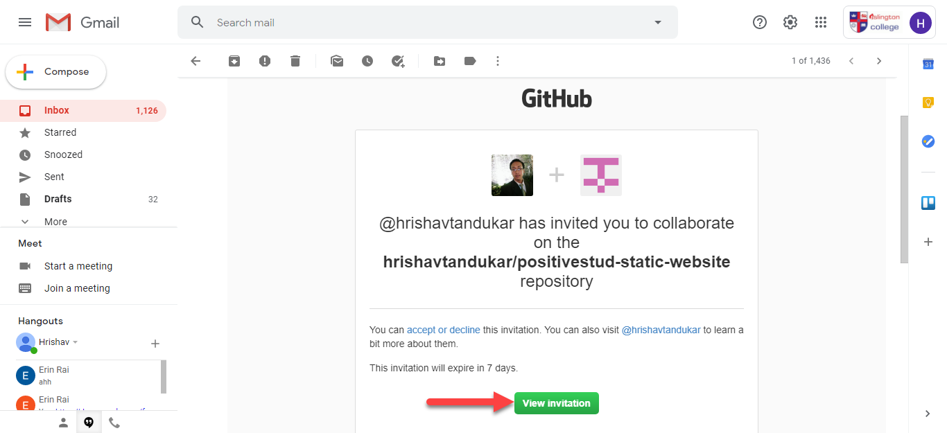 The invitation for being a collaborator in the GitHub repository is sent via Gmail.