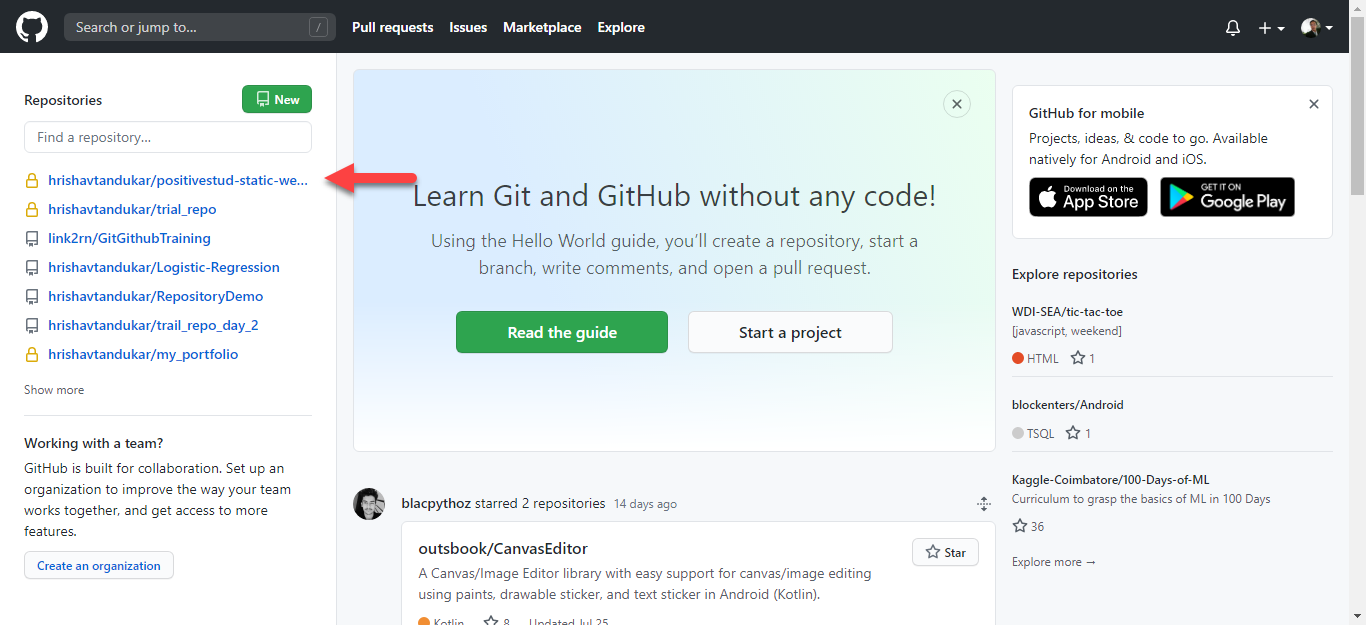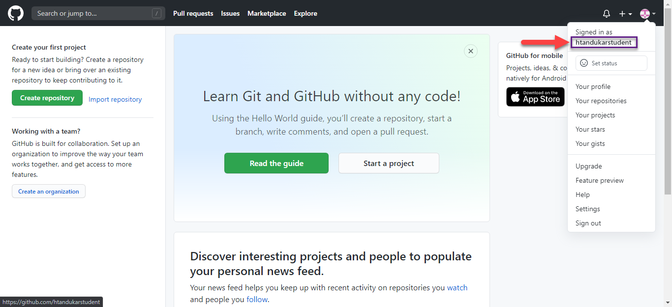 Note: Get the ‘username’ or ‘email’ of the member who should be added as a collaborator in the GitHub repository. You can obtain the username by clicking on the profile icon as shown in the image below.