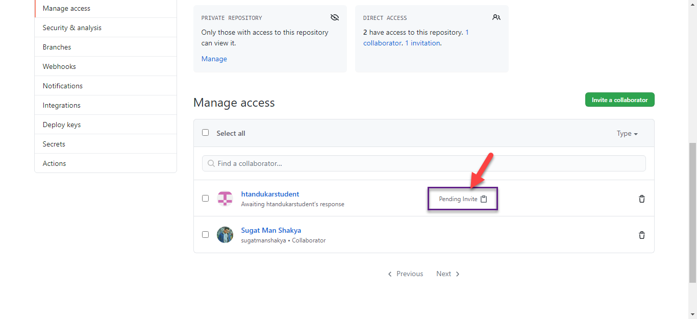 Step 7: Now, the collaborator should accept the invitation. If the collaborator has not accepted the invitation than ‘Pending Invite’ is shown in the name of the collaborator.