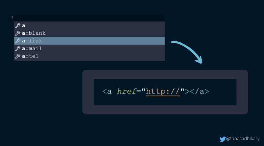 You can type a few initial letters of any HTML tags to create elements with the required attributes. The image below shows the possibilities to create the anchor tag with different attributes.